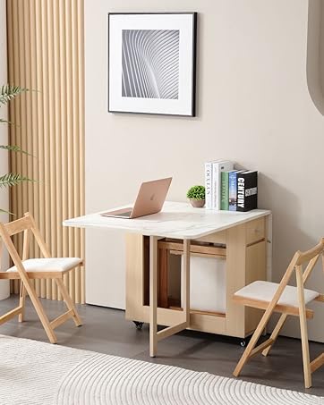 Drop Leaf Table Extendable, Foldable Kitchen Table Space Saving, Folding Dining Table with 2 Drawers and 4 Wheels, Dining Table for Living Room, Farmhouse, RV(Marble Wood)