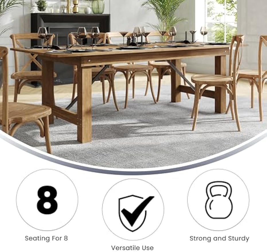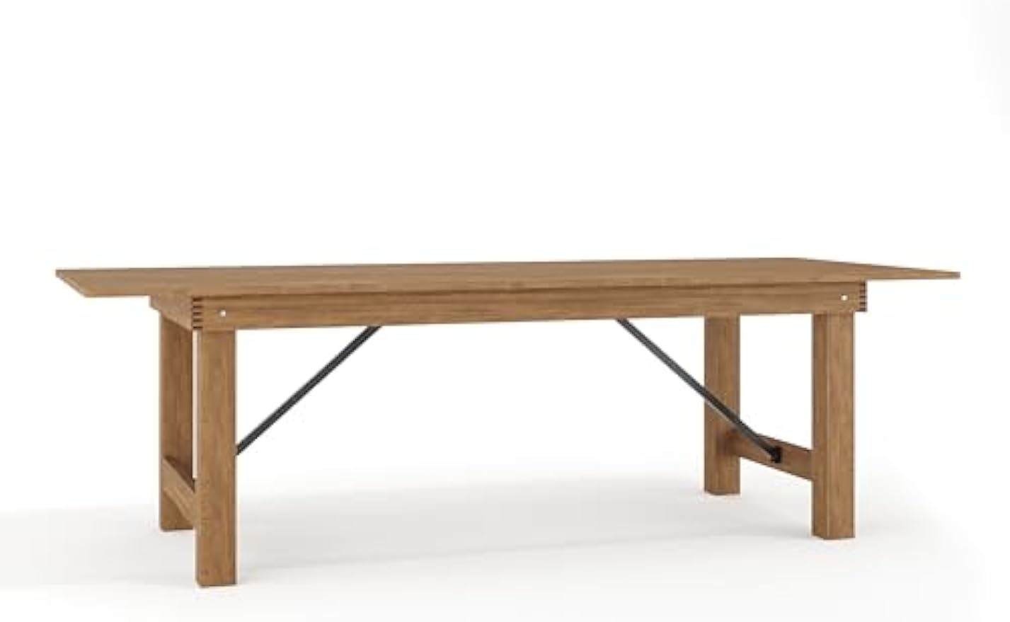 Enhance any dining room or event space with the rustic style of the Flash Furniture Hercules Series Antique Rustic Solid Pine Folding Farm Table. This folding dining table boasts an on-trend, country-rustic design to create the perfect farmhouse atmosphere in the heart of your home where family, friends, and guests can come together for delicious food and great conversation. Constructed from solid pine with a 0.75" thick plank top and supportive 4" thick apron underneath, this rustic event table is as durable as it is attractive. It's suitable for daily use in hospitality industries and while intended for indoor use, it can be taken outdoors during good weather. With a highly-efficient design, the pins provide maximum stability while in use and can be pulled out to fold the legs that lock underneath the table when you need to move the table out of the way. The folding event table measures 40" W x 96" D x 30" H when open to comfortably seat up to 8 adults and 96" W x 5" D x 29.75" H when folded for compact storage in-between events. Cleaning is a breeze - use a water based cleaner and follow-up with a dry cloth.