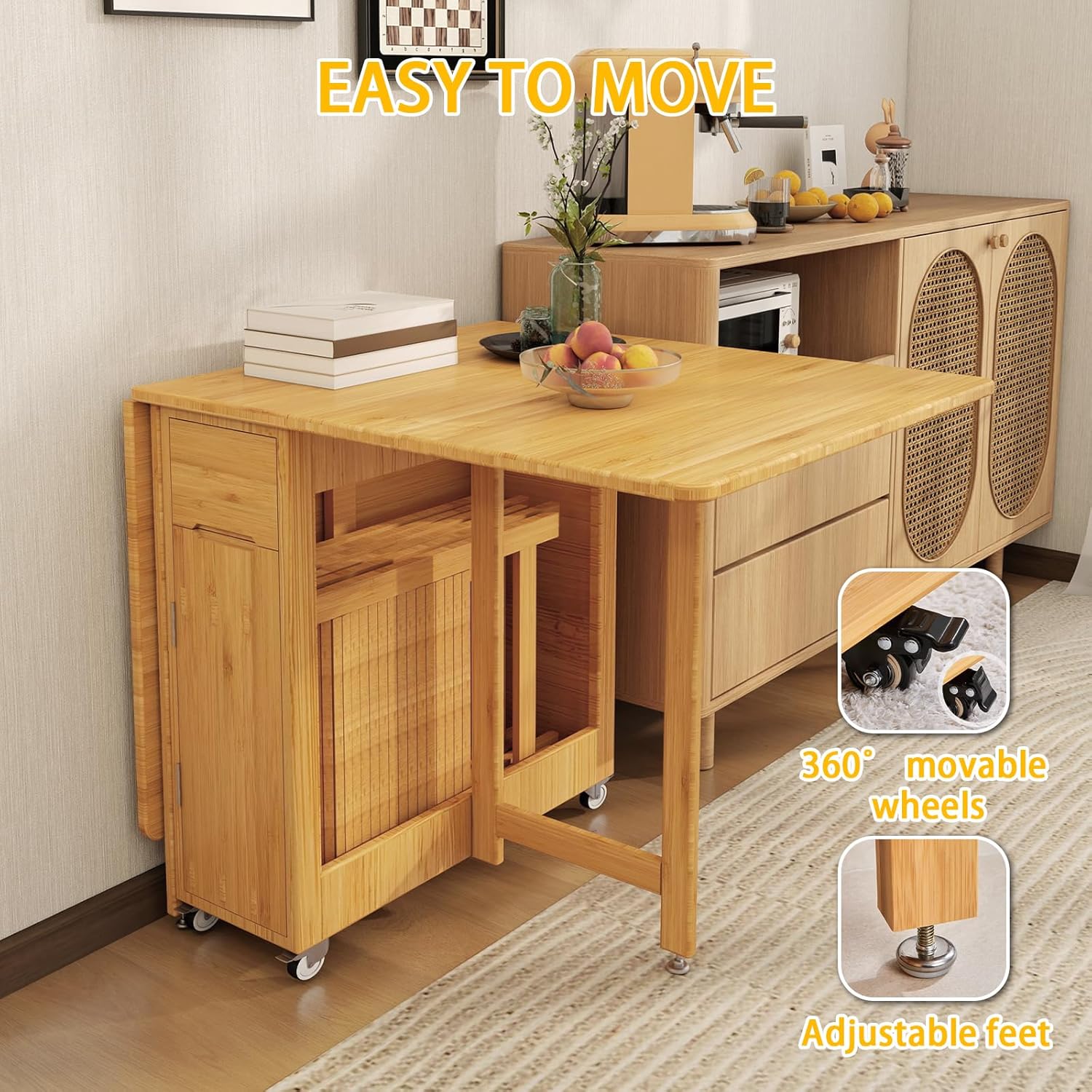 Folding Dining Table Set for 4 with Chairs,Saving Spaces Foldable Drop-Leaf Table Bamboo Collapsible Dinette with Storage for Small Spaces Dining Room Kitchen,No Assembly Required(Wood Color)